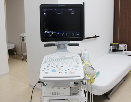 体の表面に超音波をあて、腎・膀胱・前立腺・精巣等の病気の診断、残尿の測定等を行う装置です。経直腸プローブを使用した前立腺組織検査が可能です。